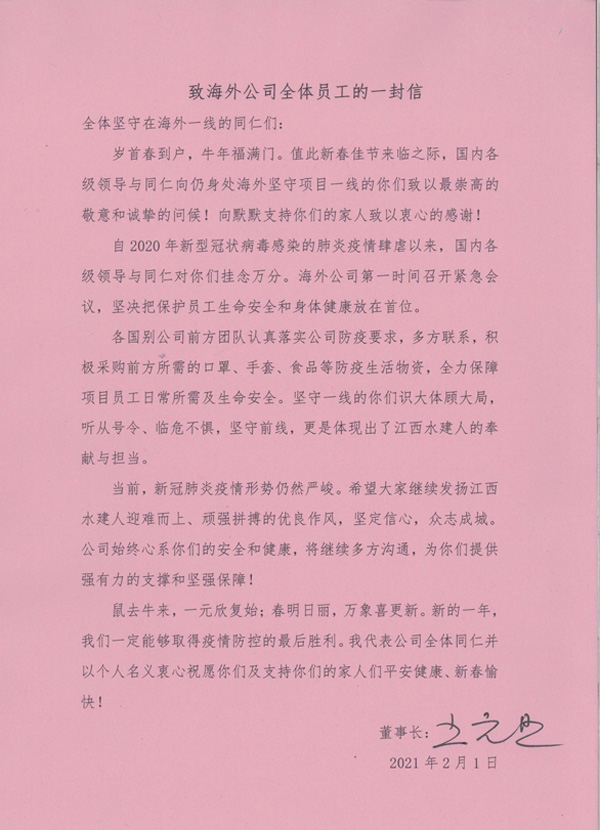 當(dāng)前,新冠肺炎疫情形勢仍然嚴(yán)峻。希望大家繼續(xù)發(fā)揚江西水建人迎難而上、頑強拼搏的優(yōu)良作風(fēng),堅定信心,眾志成城。公司始終心系你們的安全和健康,將繼續(xù)多方溝通,為你們提供強有力的支撐和堅強保障!
