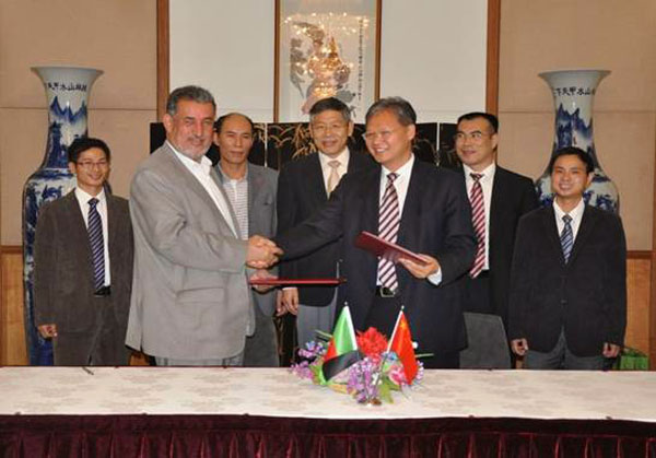 徐飛洪大使(右三)與阿方能源水利部水務(wù)司長穆罕穆迪(左二)互換移交證書