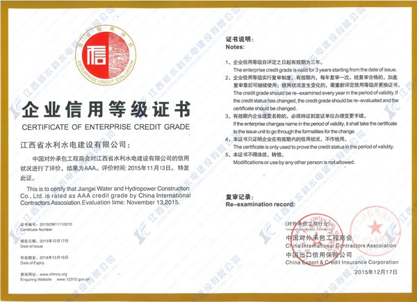 根據(jù)商務(wù)部、國資委聯(lián)合發(fā)布的《商會協(xié)會行業(yè)信用建設(shè)工作指導(dǎo)意見》和《關(guān)于進(jìn)一步做好行業(yè)信用評價(jià)工作的意見》的要求,結(jié)合承包商會關(guān)于推進(jìn)行業(yè)信用體系建設(shè)的工作部署,承包商會于2015年7月啟動2015年度對外承包工程企業(yè)與勞務(wù)合作企業(yè)信用等級評價(jià)工作,經(jīng)對外承包工程企業(yè)與勞務(wù)合作企業(yè)信用等級評審委員會第十一次工作會議審議,江西省水利水電建設(shè)有限公司被評定為2015年度對外承包工程企業(yè)信用評價(jià)AAA級信用企業(yè)。