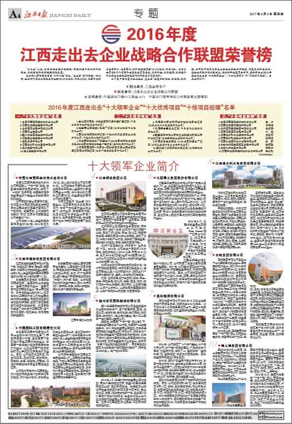 6月3日,江西走出去企業(yè)戰(zhàn)略合作聯(lián)盟2017年大會(huì)在南昌召開。省委常委、常務(wù)副省長(zhǎng)毛偉明出席大會(huì)并作重要講話,會(huì)上省委常委、常務(wù)副省長(zhǎng)毛偉明、省政府秘書長(zhǎng)王亞聯(lián)和省商務(wù)廳廳長(zhǎng)王水平分別為2016年度全省走出去“十大領(lǐng)軍企業(yè)”、“十大優(yōu)秀項(xiàng)目”和“十佳項(xiàng)目經(jīng)理”授牌。江西走出去企業(yè)戰(zhàn)略合作聯(lián)盟輪值主席、中國(guó)江西國(guó)際經(jīng)濟(jì)技術(shù)合作公司總經(jīng)理徐國(guó)建報(bào)告了2016年工作,國(guó)家開發(fā)銀行江西分行、中國(guó)進(jìn)出口銀行江西省分行和中國(guó)出口信用保險(xiǎn)公司南昌營(yíng)管部作為聯(lián)盟副主席單位發(fā)言。公司董事長(zhǎng)王元旦作為十大優(yōu)秀項(xiàng)目的企業(yè)代表發(fā)言?!督魅?qǐng)?bào)》、《江西衛(wèi)視》相繼對(duì)大會(huì)進(jìn)行了大幅報(bào)道。