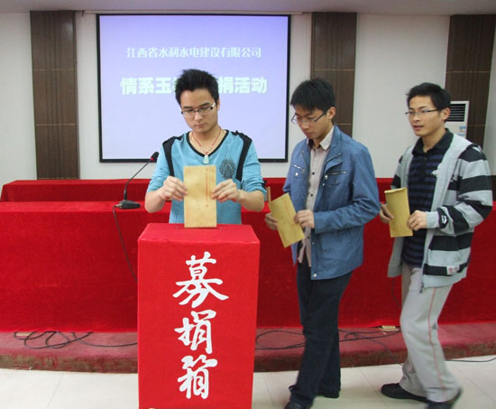 2010年4月14日,青海省玉樹縣發(fā)生兩次地震,最高震級7.1級,造成了當(dāng)?shù)鼐薮蟮娜松韨龊拓敭a(chǎn)損失,“玉樹地震”牽動著億萬人民的心,也牽動著我司所有員工的心!公司在全司范圍內(nèi)積極開展“情系玉樹募捐活動”,4月26日,我公司南昌市機關(guān)總部首先開展了“情系玉樹募捐活動”,公司中層以上管理人員和員工踴躍參與募捐活動,紛紛獻上自己的一份愛心,體現(xiàn)出江西水總?cè)说纳鐣?zé)任感!同時,各分公司、國內(nèi)外施工項目部也在開展此項活動,預(yù)計此項活動將募得資金3萬余元。