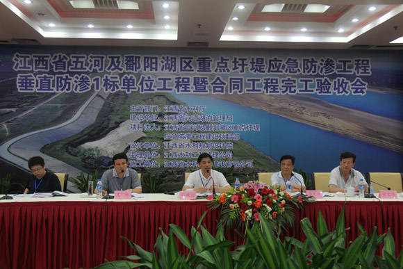 2011年5月8日,我公司承建的江西省五河及鄱陽湖區(qū)重點圩堤應(yīng)急防滲處理工程垂直防滲1標單位工程暨合同工程完工驗收會在南昌市召開。省水利廳廳長孫曉山,廳紀委書記李東江,副廳長文林、廳總工張文捷,省發(fā)改委、省財政廳、省水利廳有關(guān)處室及有關(guān)單位負責(zé)人,南昌市水利局等領(lǐng)導(dǎo)出席了會議。