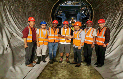 Wolkite隧洞工程襯砌砼施工長度3.1千米,共劃分257個澆筑單元,計劃施工工期12個月。一個月時間內(nèi)項目部全體成員攻堅克難,先后完成了2套襯砌鋼模臺車洞外安裝,1.5千米距離移動調(diào)試,防水系統(tǒng)無損固定及現(xiàn)場熱熔焊接,隧洞雙層鋼筋有限支撐的全斷面安裝工藝試驗。通過40米通風(fēng)豎井垂直向下往洞內(nèi)泵送550米砼工藝試驗,體現(xiàn)了水建人艱苦奮斗、敢于創(chuàng)新的精神。