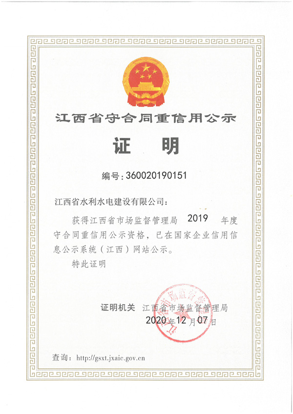 近日,公司獲評(píng)2019年度江西省守合同重信用公示資格。