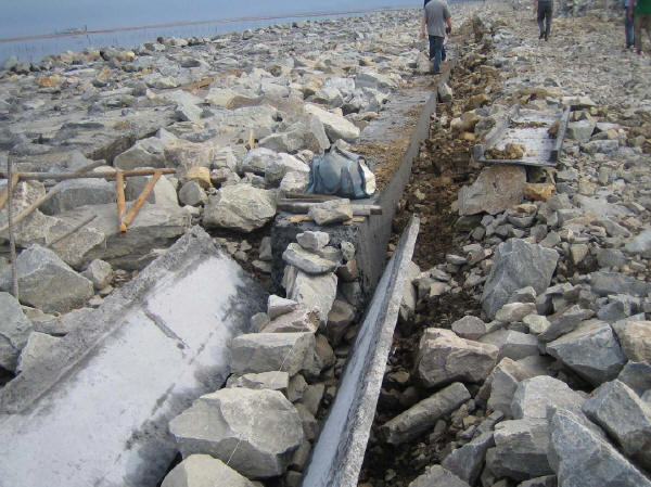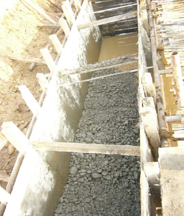 基坑開(kāi)挖:驗(yàn)收前,施工單位應(yīng)對(duì)地下水或地表水作妥善引排或封堵,清理積渣雜物,作好高程、軸線(xiàn)的測(cè)量復(fù)核、記錄,并設(shè)樁拉線(xiàn)。驗(yàn)收合格后,方可安排砌石或澆筑混凝土。