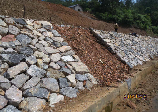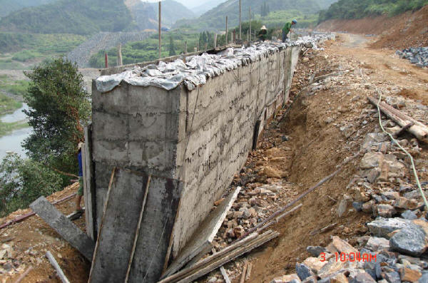 擋墻砌筑應(yīng)分層,每一砌筑層擺石時(shí)均應(yīng)座漿,隨鋪漿隨砌筑。嚴(yán)禁石塊大面無(wú)漿直接貼靠。混凝土必須用振搗器逐縫振搗。當(dāng)豎縫寬度在5cm以上時(shí),可填漿后塞片石。嚴(yán)禁先堆砌石塊再用膠結(jié)料灌縫。