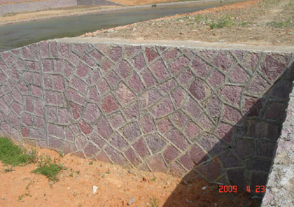 砌石護(hù)坡和擋墻面石外露面要求顏色一致,最小厚度應(yīng)不少于20cm,砌筑時(shí),上下兩層石塊應(yīng)騎縫,避免通縫,內(nèi)外石塊應(yīng)交錯(cuò)搭接。不得在面石底面無(wú)漿墊塞片石。對(duì)有勾凸縫(縫寬一般2.5cm)要求的面石,其砌縫縫寬不應(yīng)大于2.0cm。